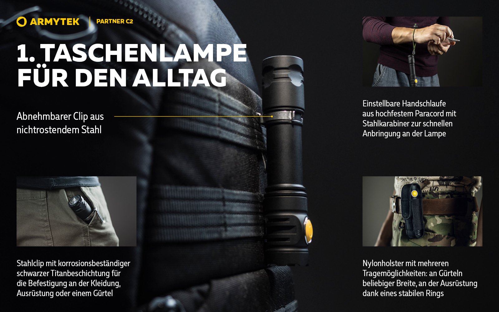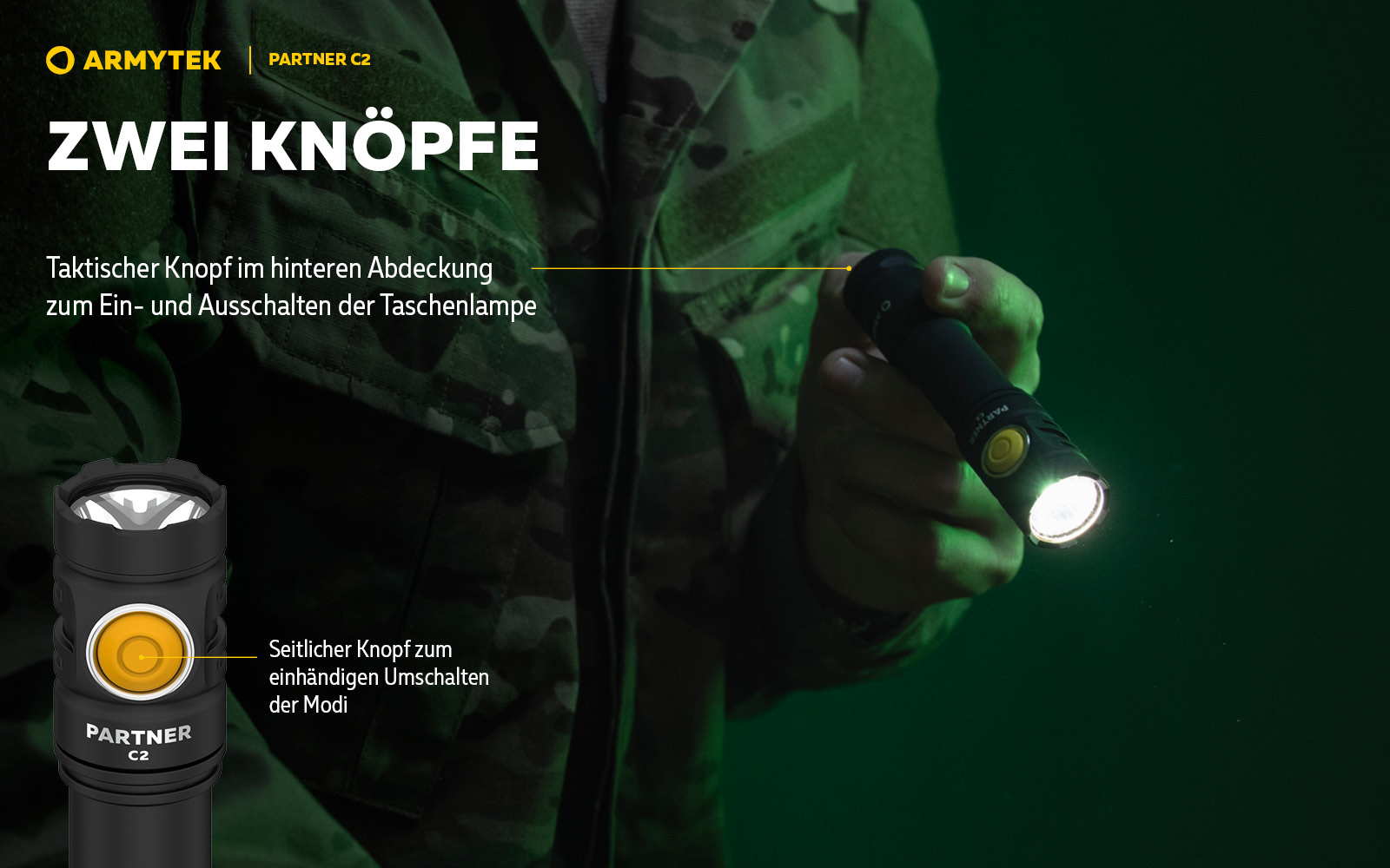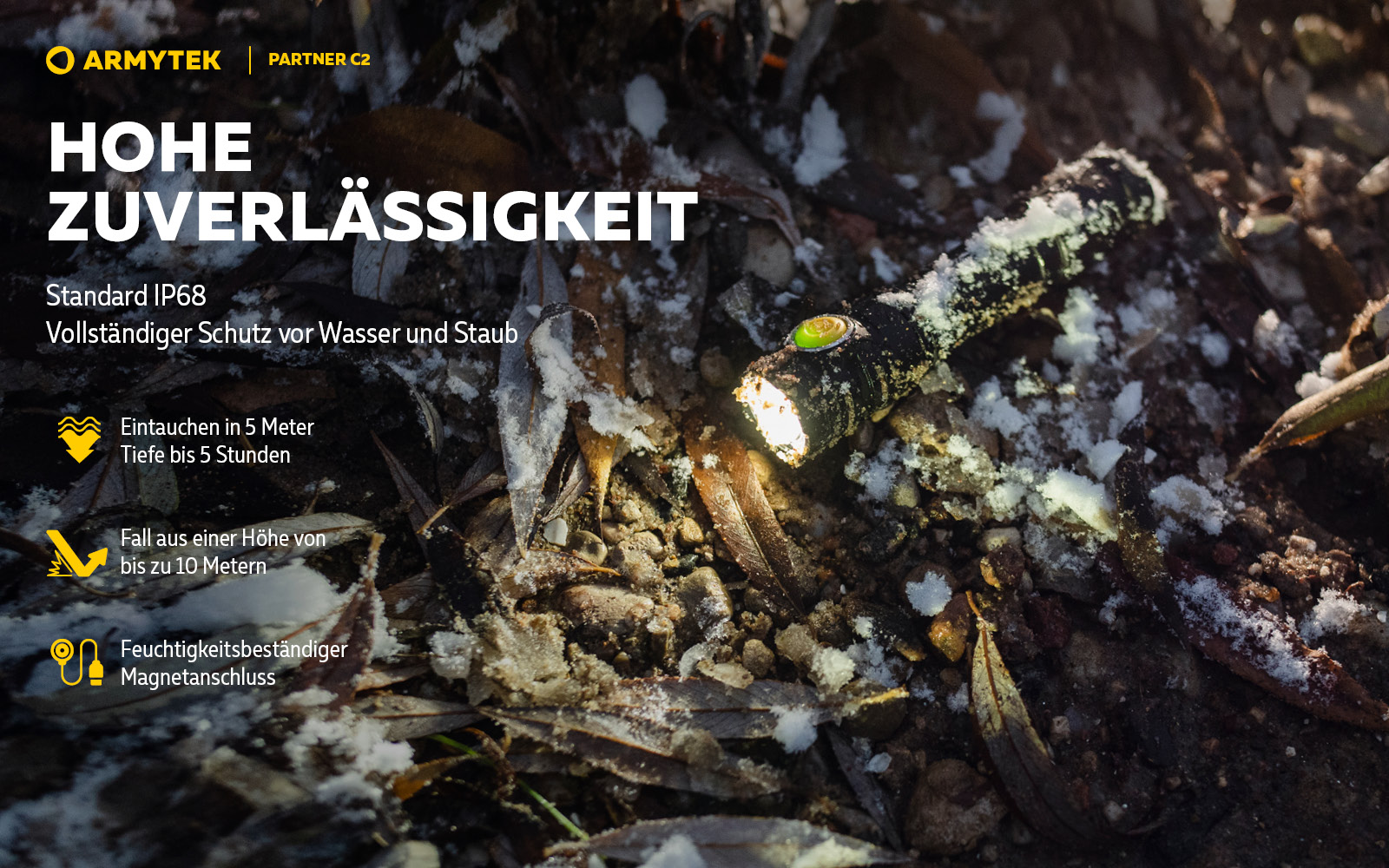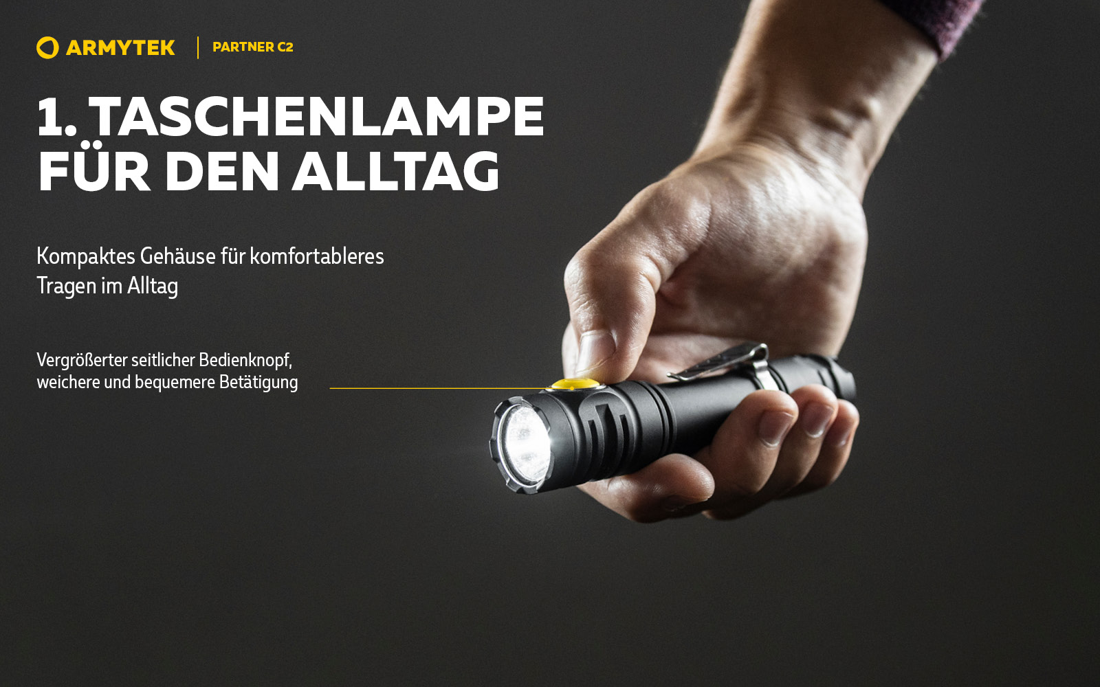 Ob beim Camping, Wandern, Angeln, auf der Jagd oder im Sicherheitsdienst – die Armytek Partner C2 ist ein verlässlicher Begleiter für alle, die Wert auf Funktionalität, Zuverlässigkeit und Ausdauer legen.