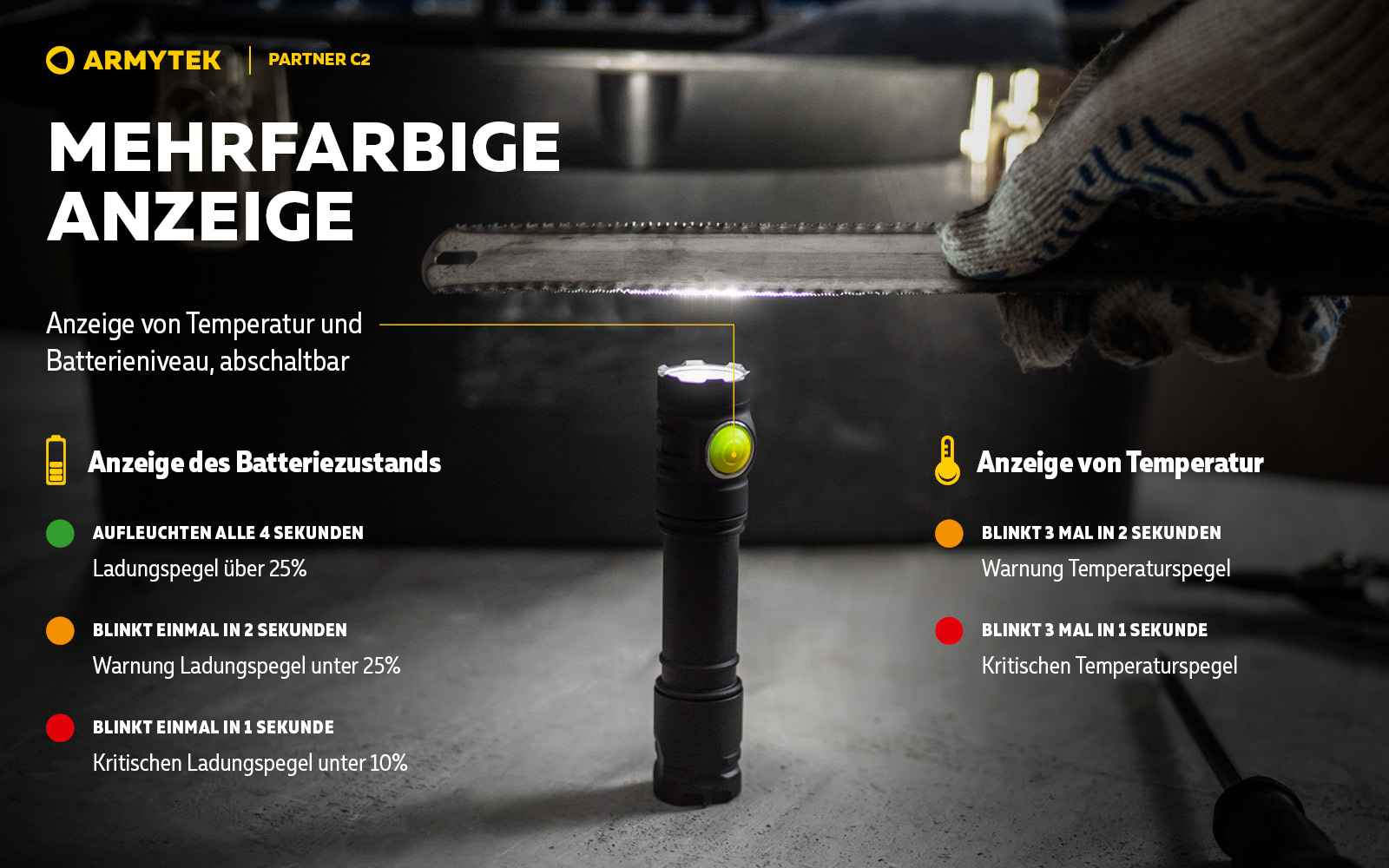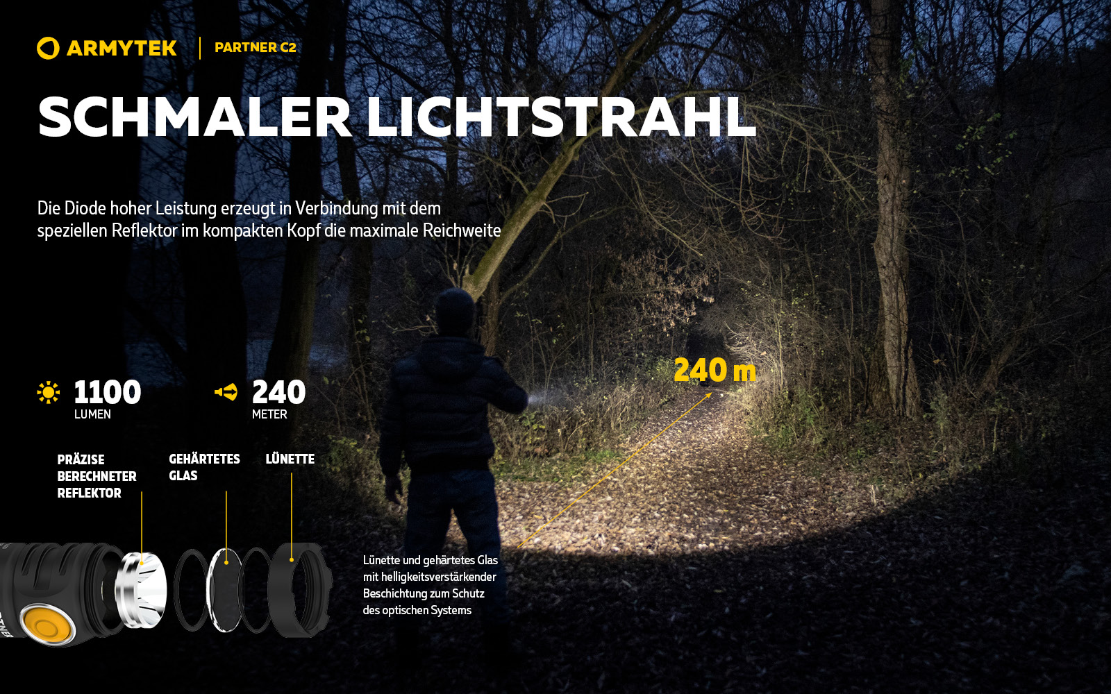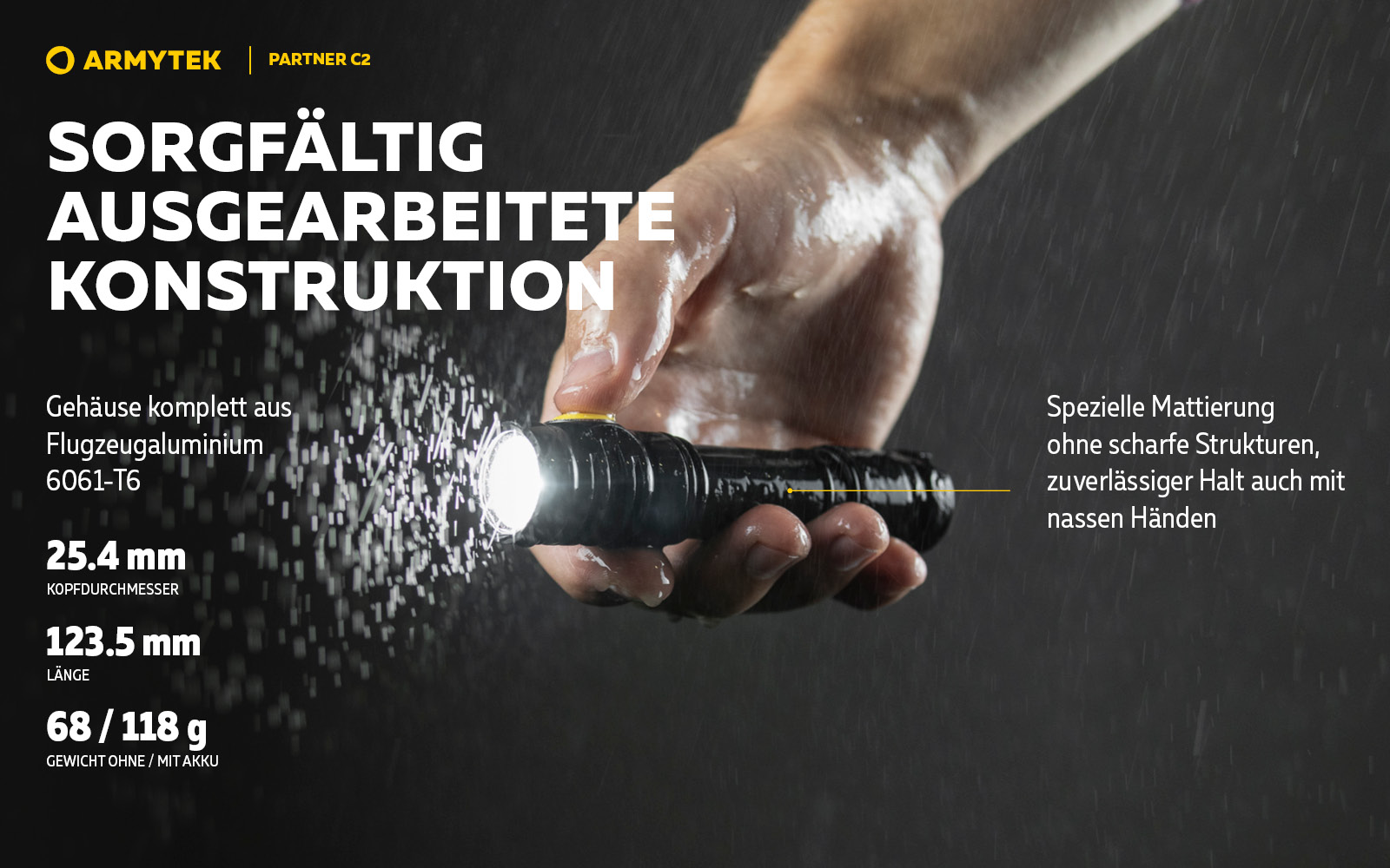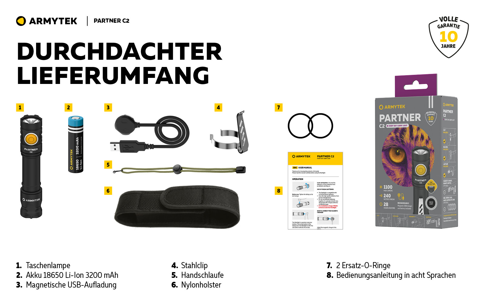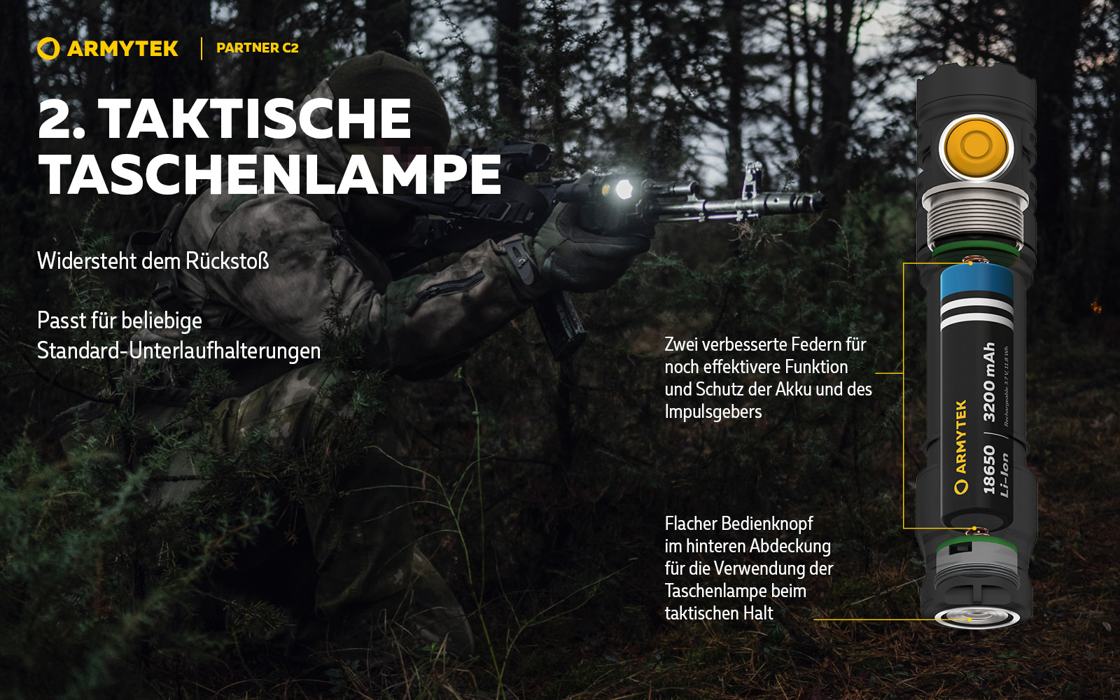 Ob beim Camping, Wandern, Angeln, auf der Jagd oder im Sicherheitsdienst – die Armytek Partner C2 ist ein verlässlicher Begleiter für alle, die Wert auf Funktionalität, Zuverlässigkeit und Ausdauer legen.