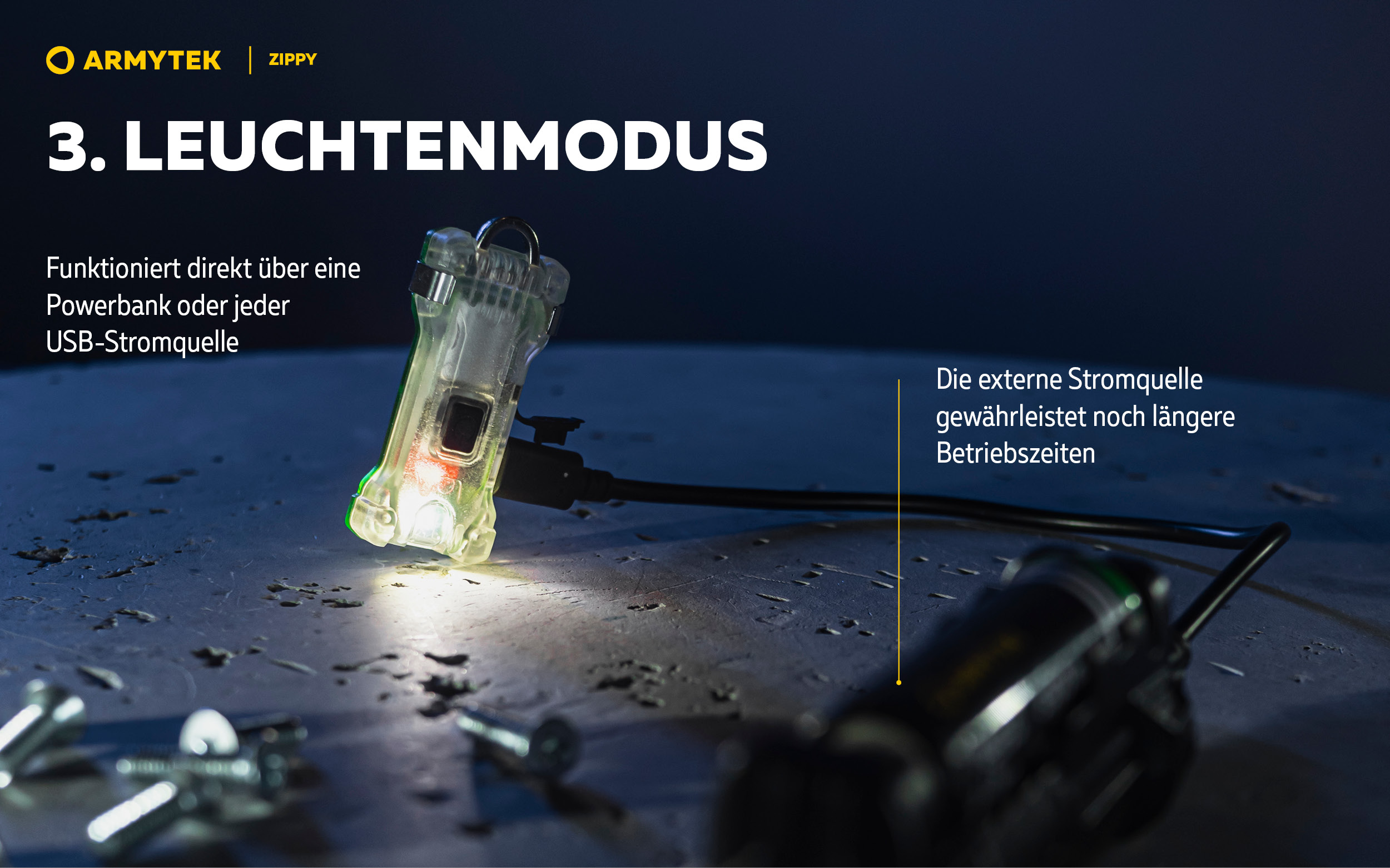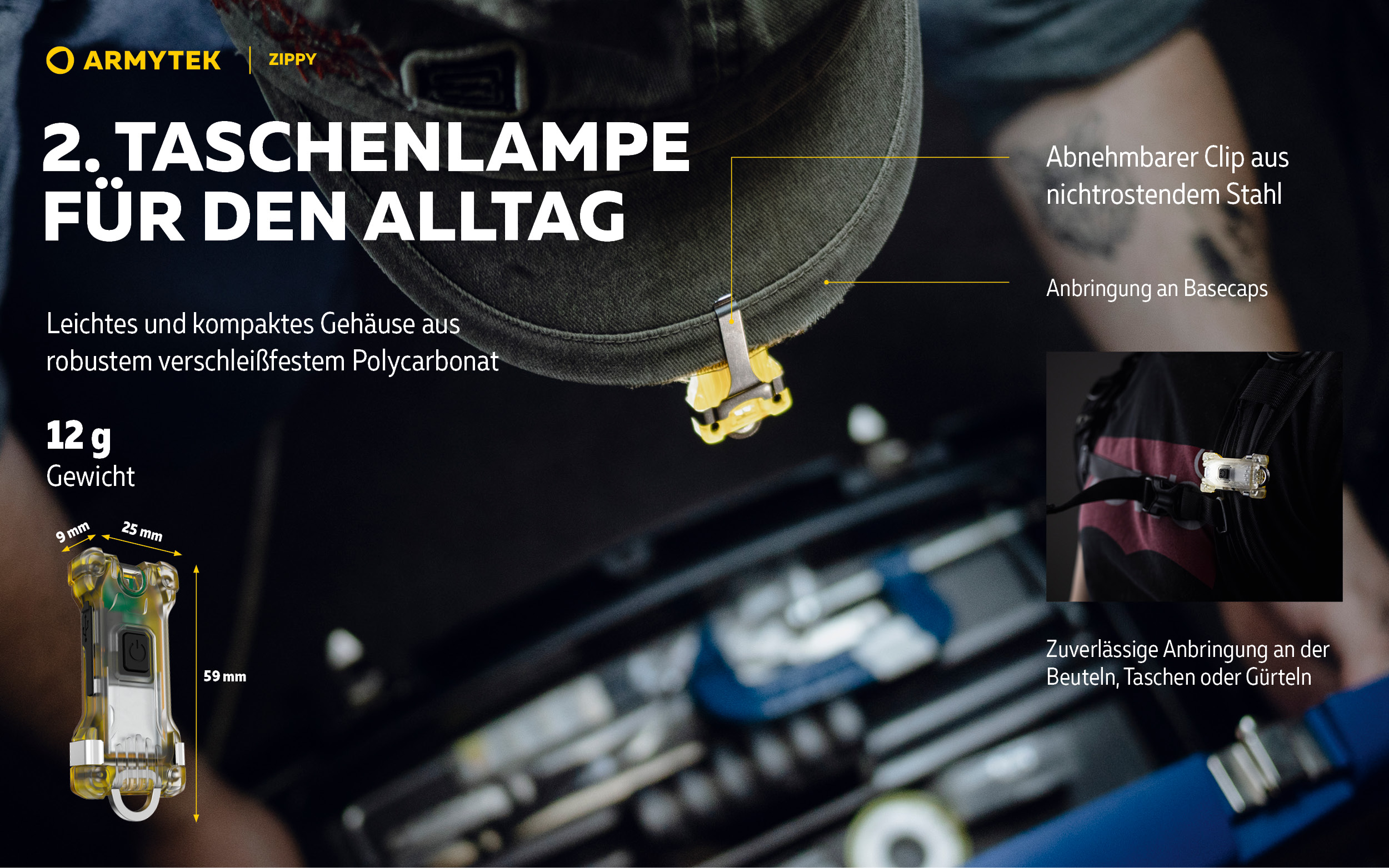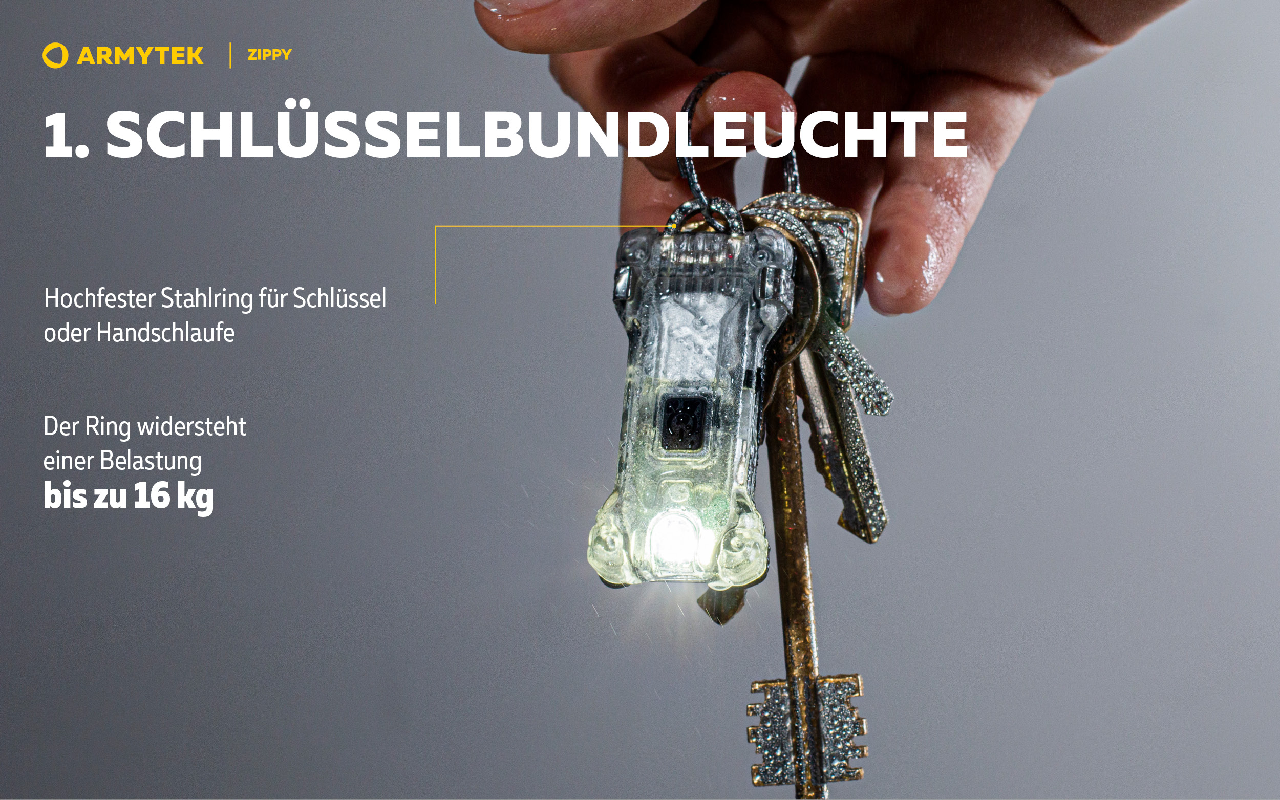 Dank ihres integrierten Li-Polymer-Akkus (100 mAh) lässt sich die Zippy bequem über Micro-USB aufladen – ganz ohne zusätzliche Batterien. Das kompakte Design mit robustem Schlüsselring und abnehmbarem Stahlclip erlaubt zahlreiche Einsatzmöglichkeiten: als Schlüsselanhänger, Mini-Arbeitslicht, Rucksacklicht oder Notfalllampe.