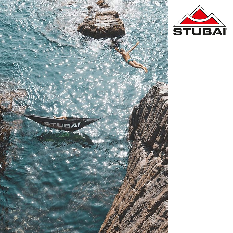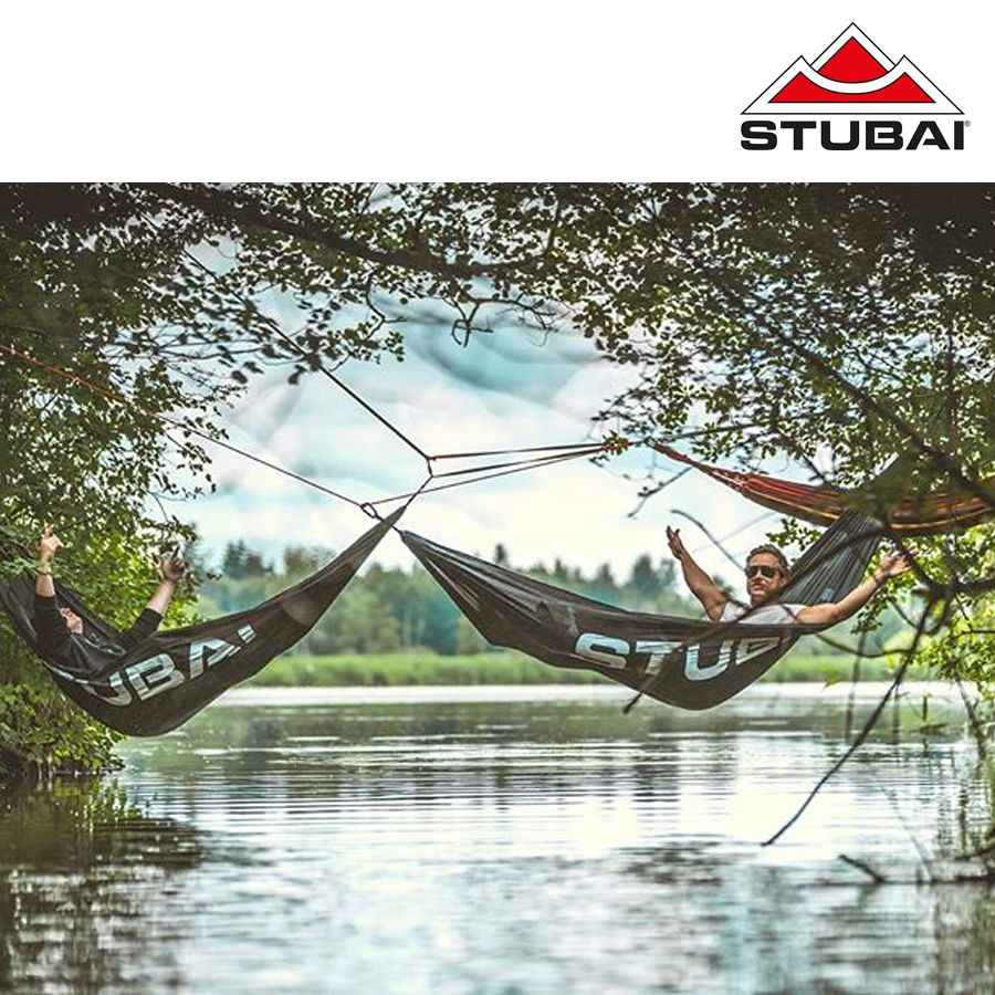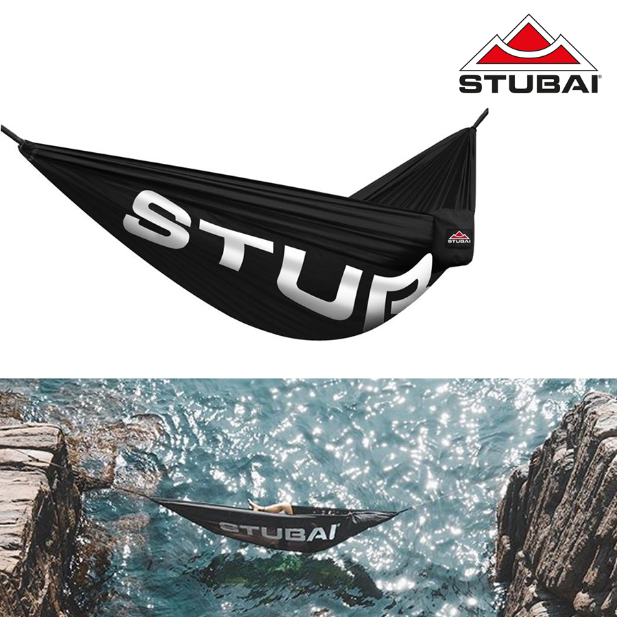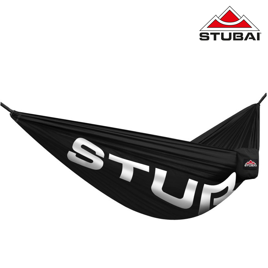 Die HAMMOCK Hängematte ist aus schwarzem Stoff gefertigt und hat seitlich eine riesige STUBAI Aufschrift. Karabiner zur Befestigung der Hängematte werden mitgeliefert.