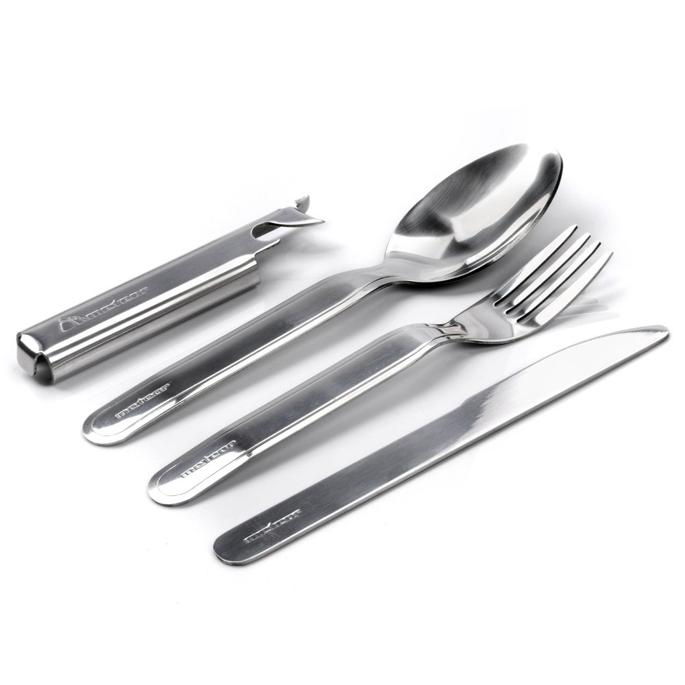 - enthält: einen Löffel, eine Gabel, ein Messer, einen Flaschenöffner und einen Dosenöffner