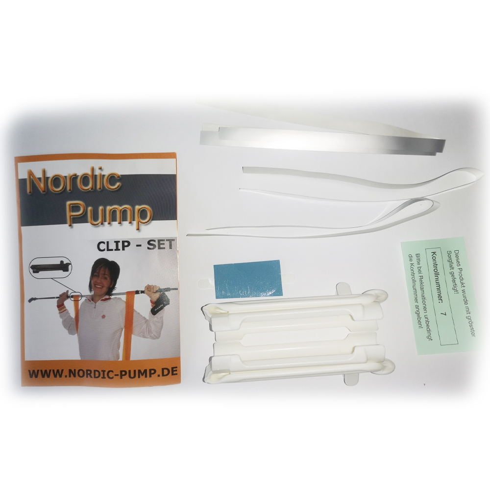 Die hochwertigen Nordic-Pump-Clips werden fest am Nordic-Walking-Stock angebracht. Durch die spezielle Form und dem extrem leichten Gewicht können die Clips langfristig belastet werden. Durch die Clips und einem Elastikband wird der Nordic-Walking-Stock zu einem sicheren, individuell einsetzbaren und vielseitigen Trainingsgerät, das überall und jederzeit ein hocheffektives Kräftigungstraining ermöglicht.
