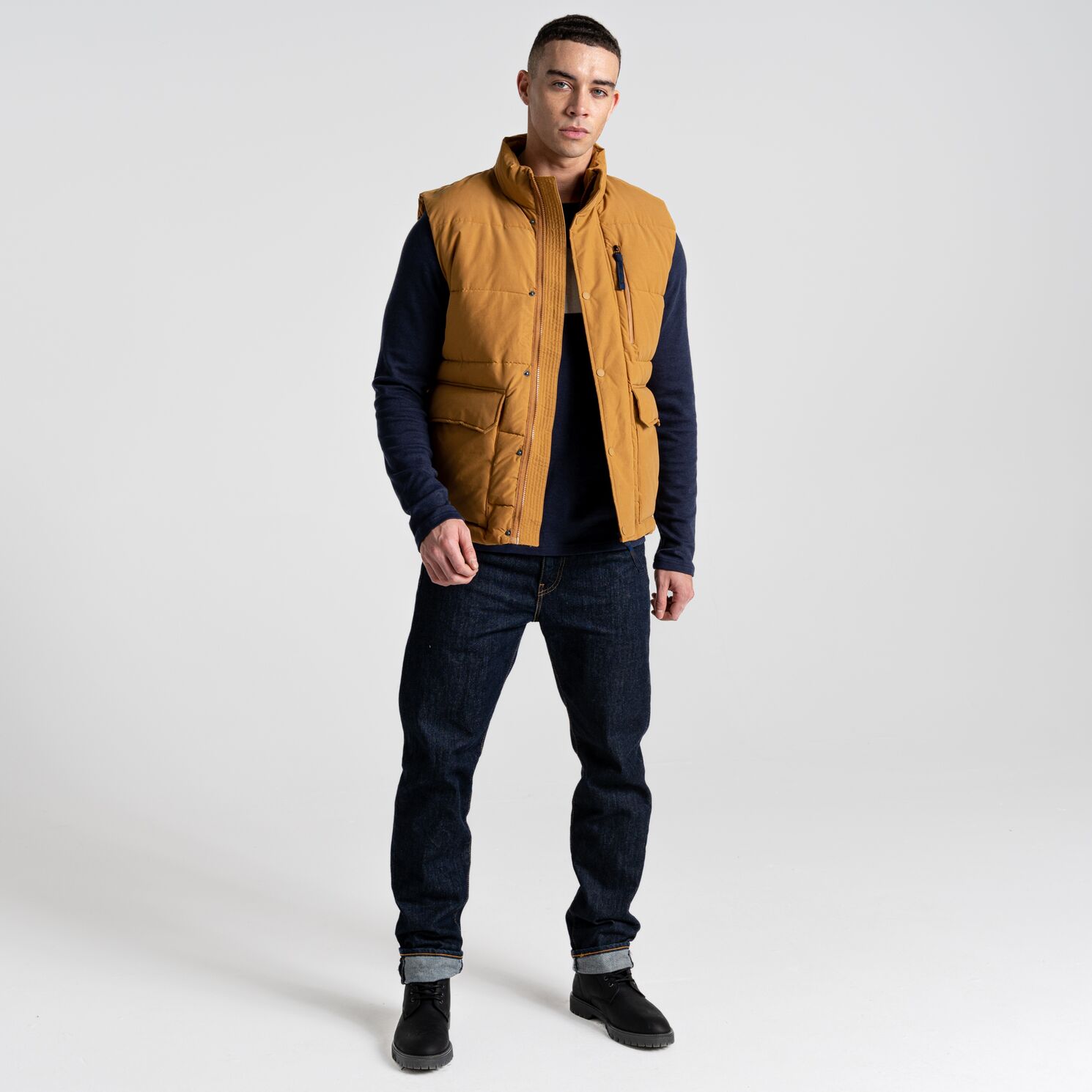 Eine kuschelig isolierende Weste von Craghoppers. „Dunbeath“ bietet eine üppige Steppung mit hochvoluminöser ThermoPro-Synthetikwattierung, die die Wärme dicht am Körper hält. Ihre gewachste Außenseite wurde zudem mit einem PFC-freien, wasserabweisenden Finish behandelt, an dem Schauer einfach abperlen. Der ideale wärmende Partner für eine wasserdichte Jacke.