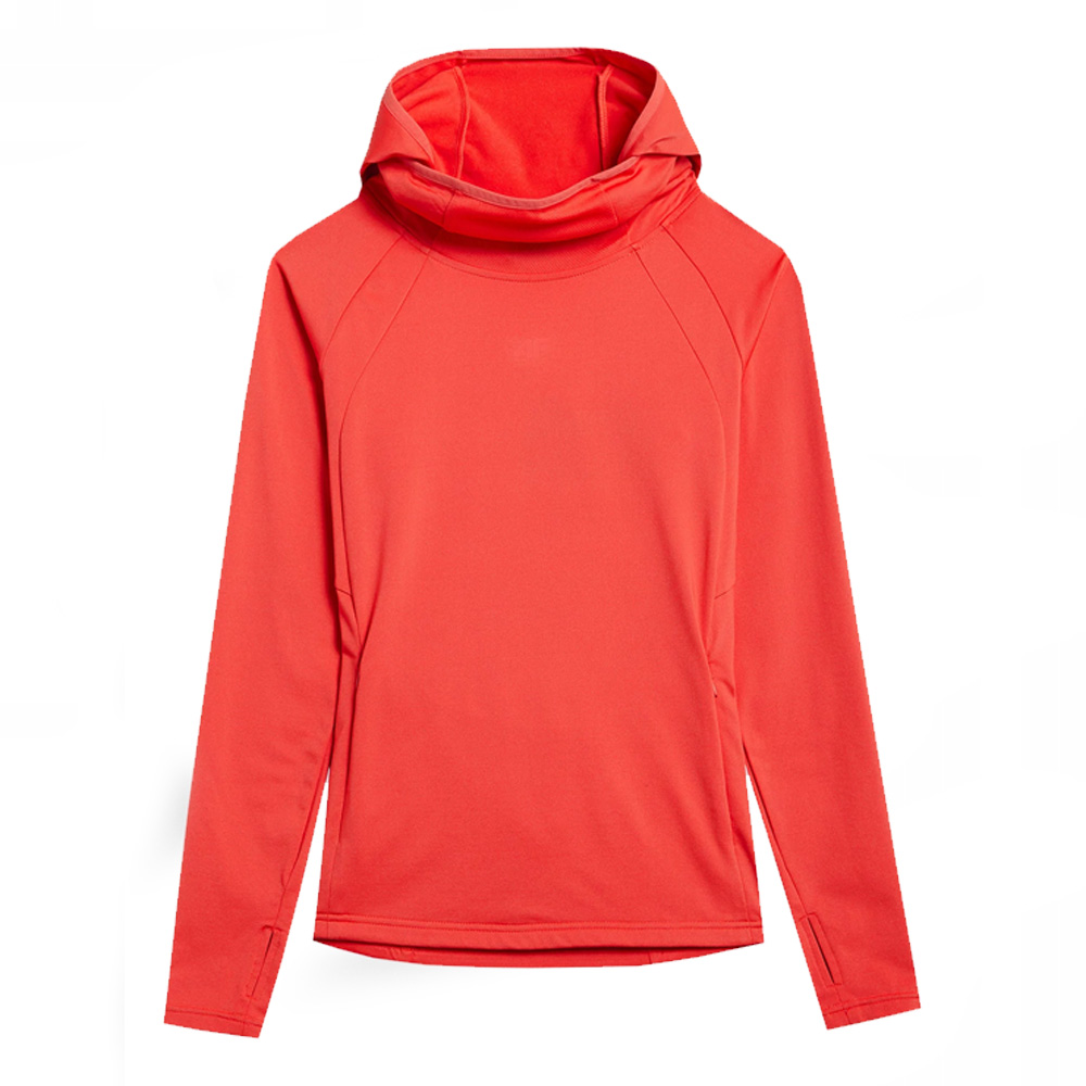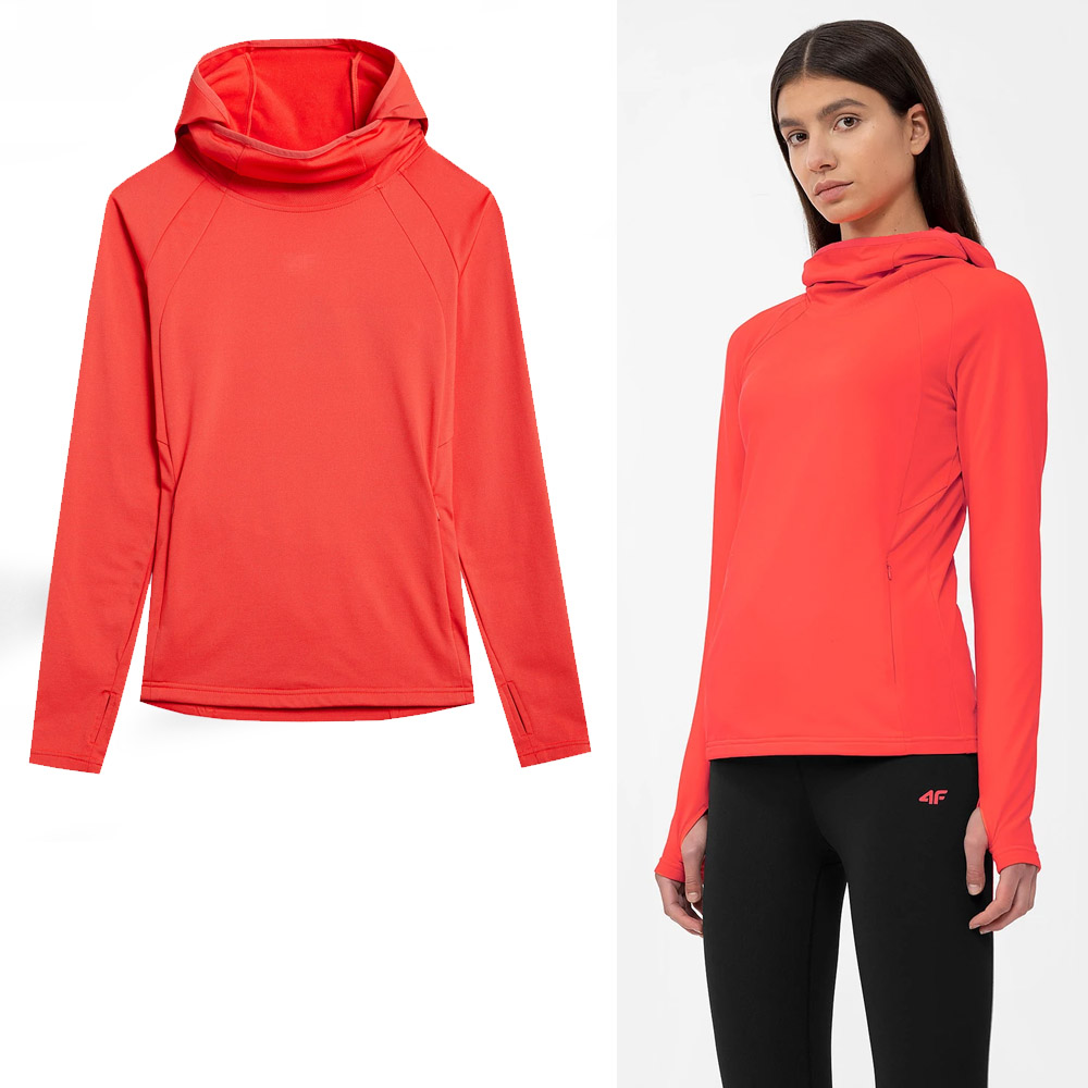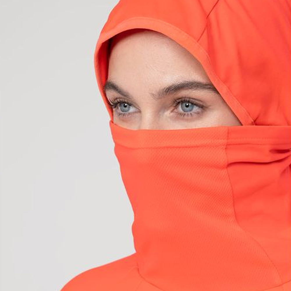 Laufshirt für Damen mit Kapuze und Maske. Es hat reflektierende Elemente und ein schnell trocknendes Finish.