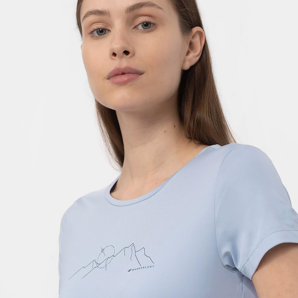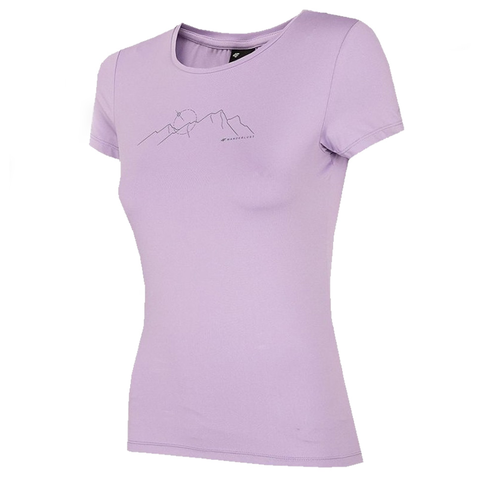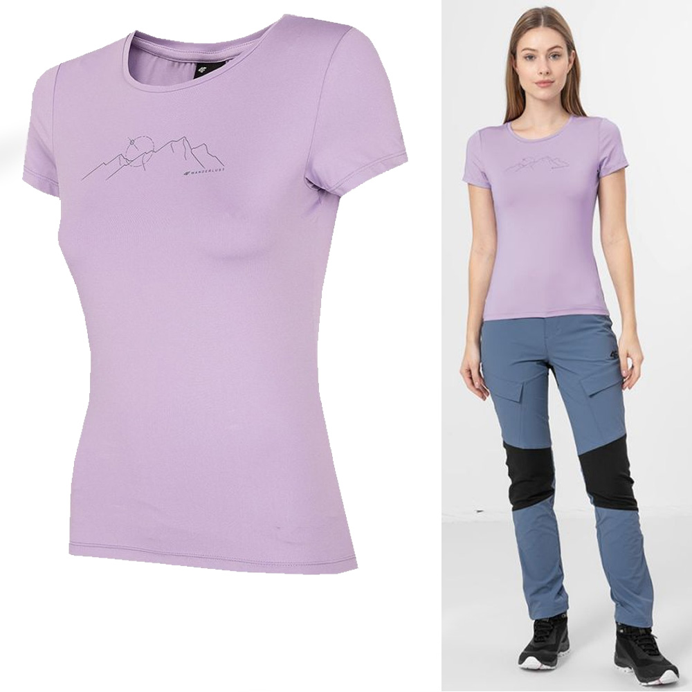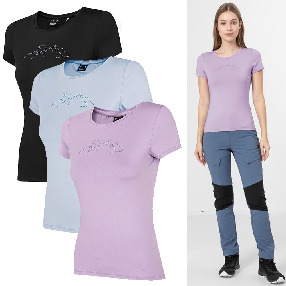 Atmungsaktives und schnelltrocknendes Damen-Trekkingshirt. Aus einem leichten, elastischen Stoff gemacht. Es wurden schnell trocknende Fasern in 4FDry-Technologie verwendet, die Feuchtigkeit vom Körper fernhalten.