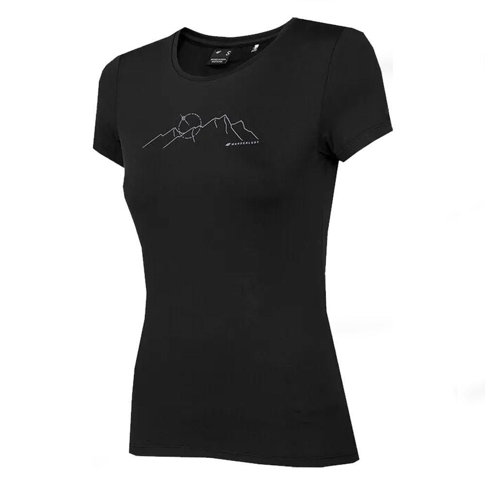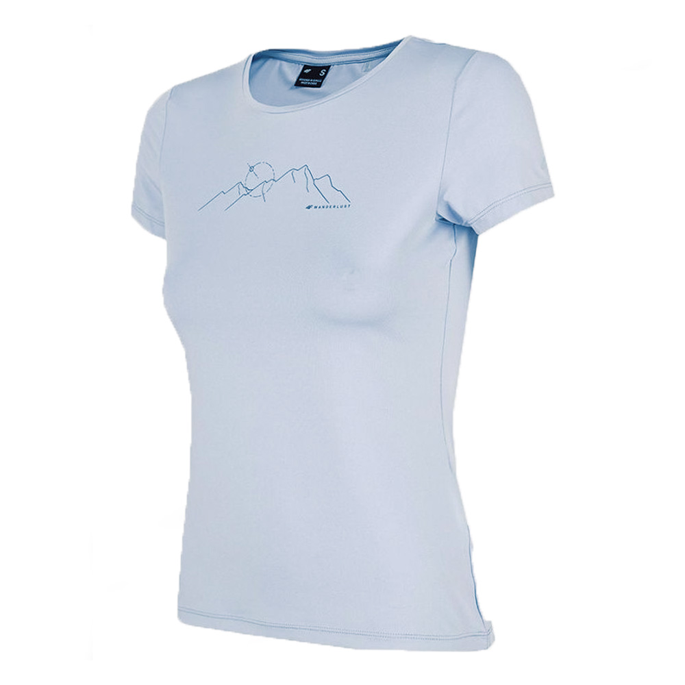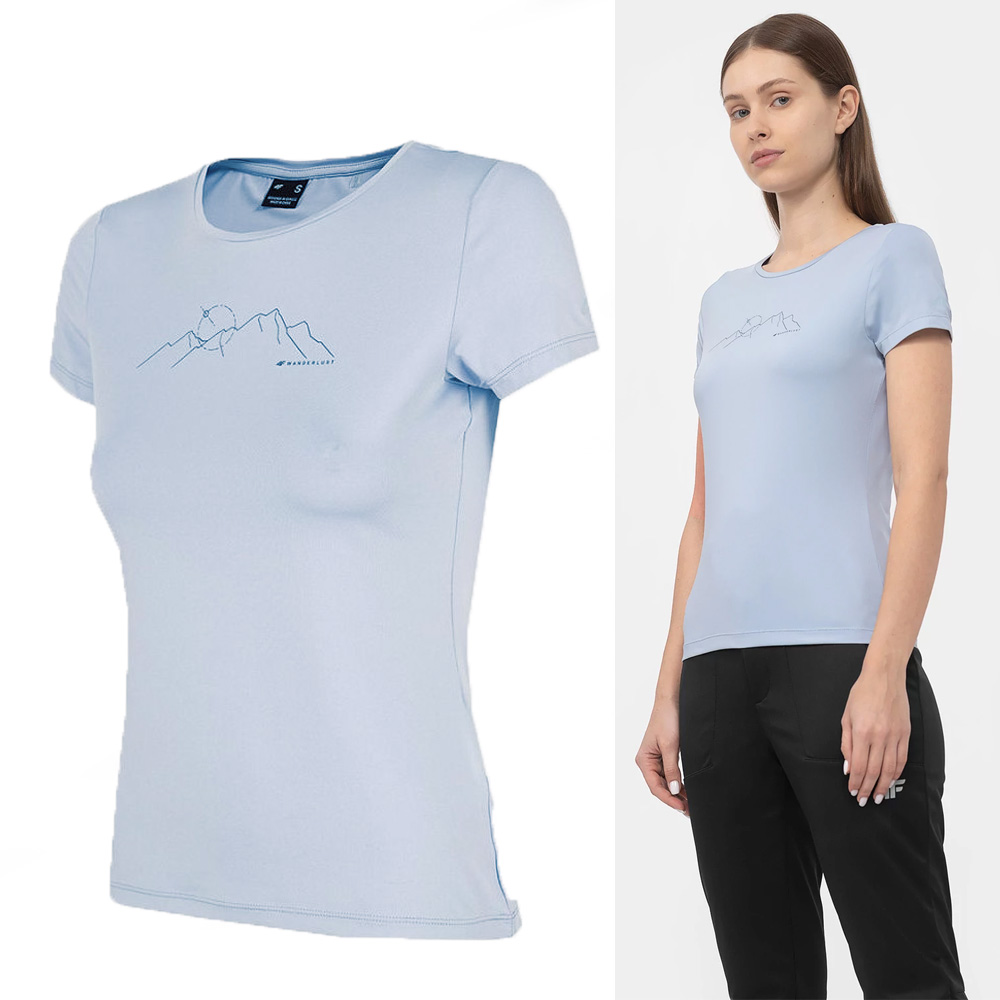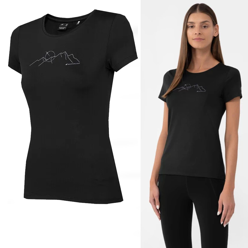 Atmungsaktives und schnelltrocknendes Damen-Trekkingshirt. Aus einem leichten, elastischen Stoff gemacht. Es wurden schnell trocknende Fasern in 4FDry-Technologie verwendet, die Feuchtigkeit vom Körper fernhalten.