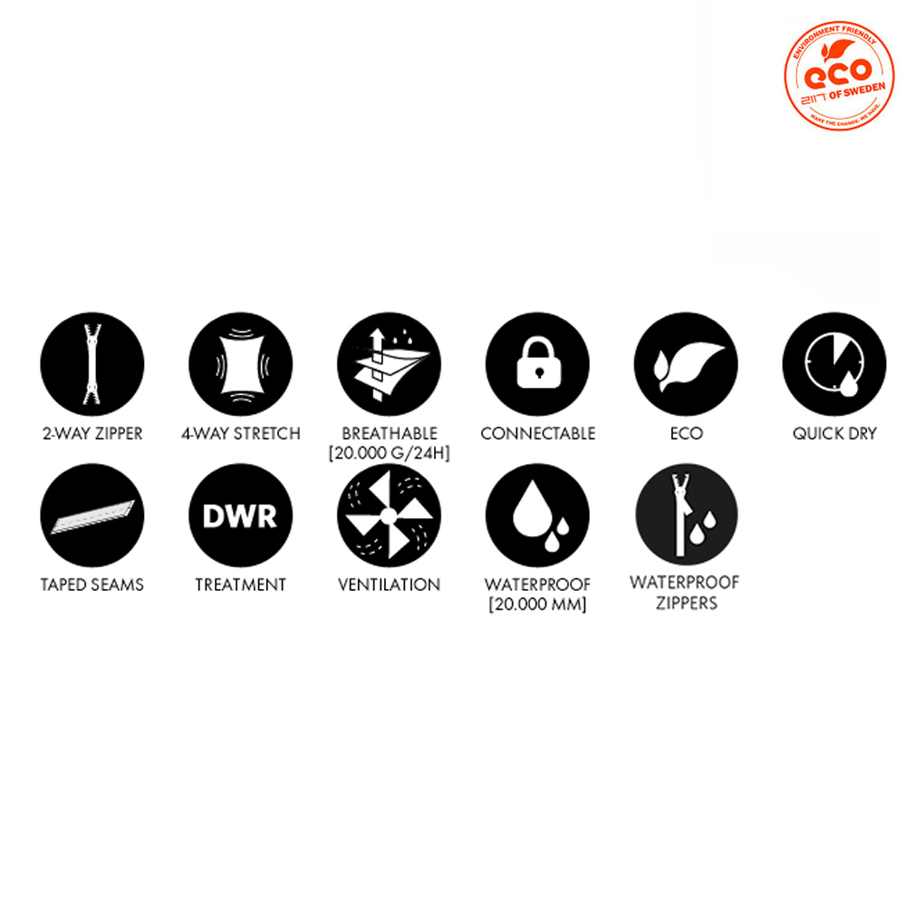Die eingesetzte High-Performance-Membran macht die Hose winddicht, wasserdicht (Wassersäule: 20.000 mm) und hoch atmungsaktiv (20.000 g/m²/24h). Damit bleibt das Körperklima auch bei intensiver Bewegung angenehm ausgeglichen.