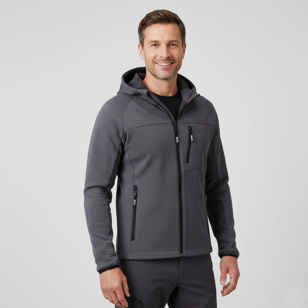 Das doppellagige Dibond-Gewebe mit strukturierter Außenseite und weicher Fleece-Innenseite schützt vor Wind und hält angenehm warm.